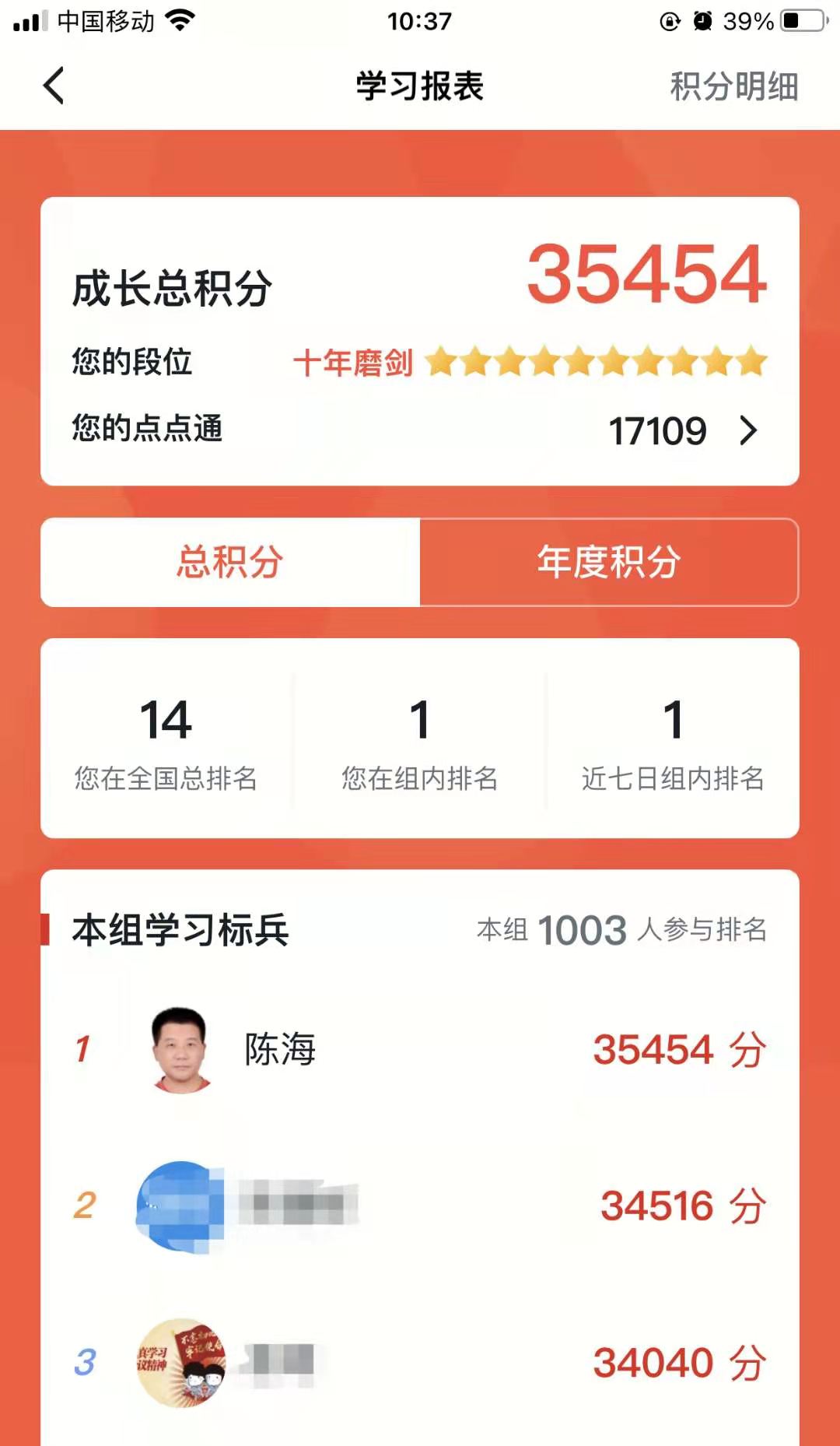 2020年9月28日,强国平台推出争上游和双人对战之后,为了拿到满分,陈海老师花费了很多时间练习挑战答题题库并多次通关,从而始终让自己的学习积分处于全国领先的行列。