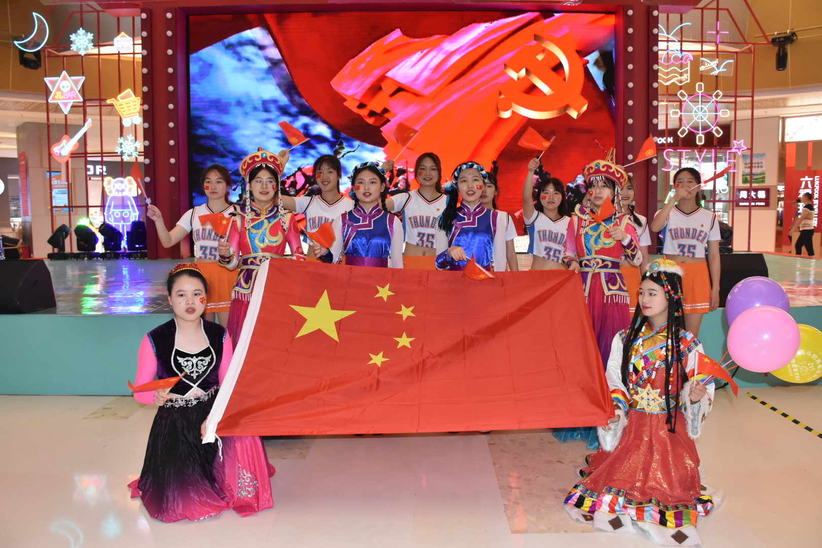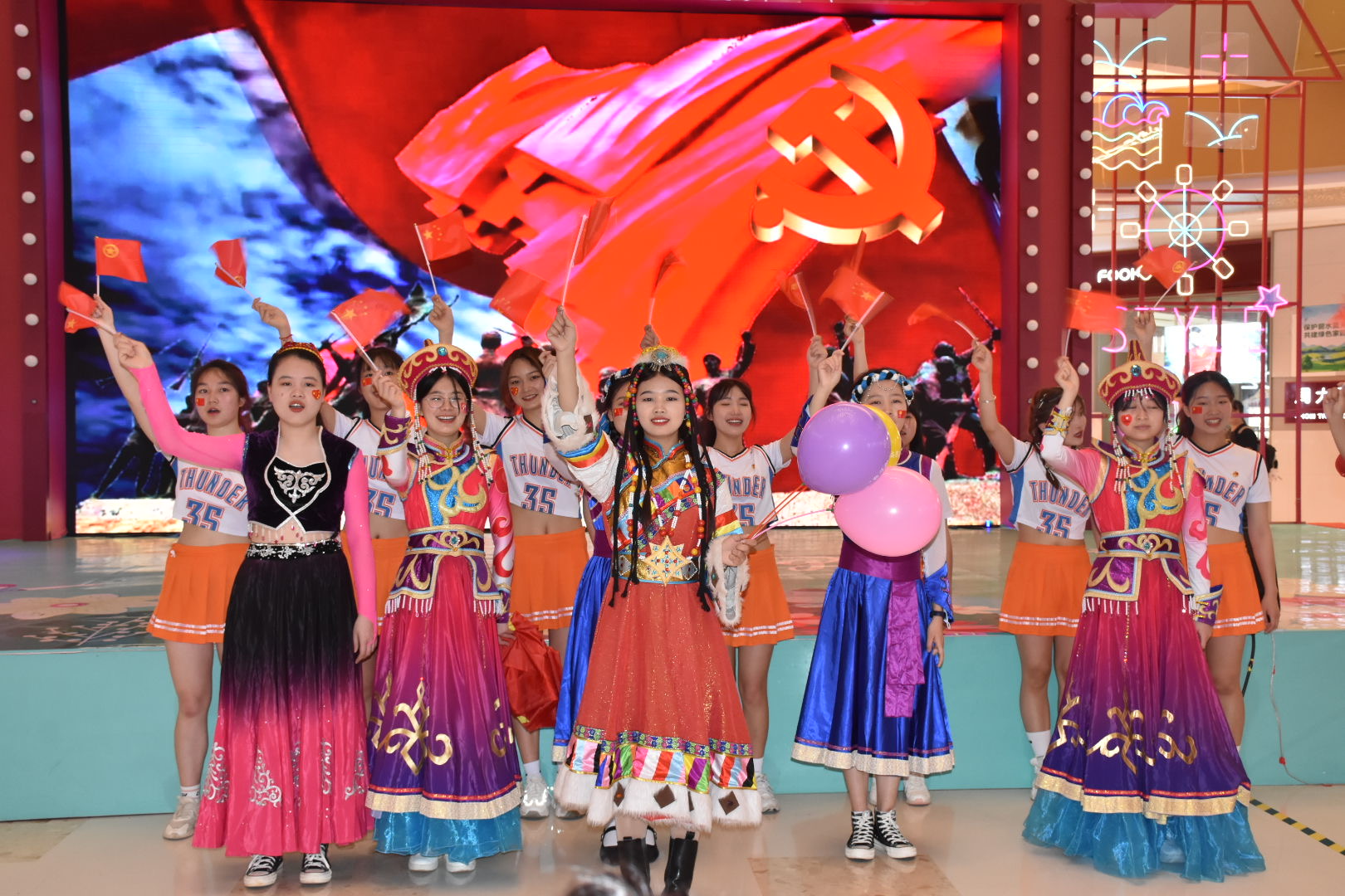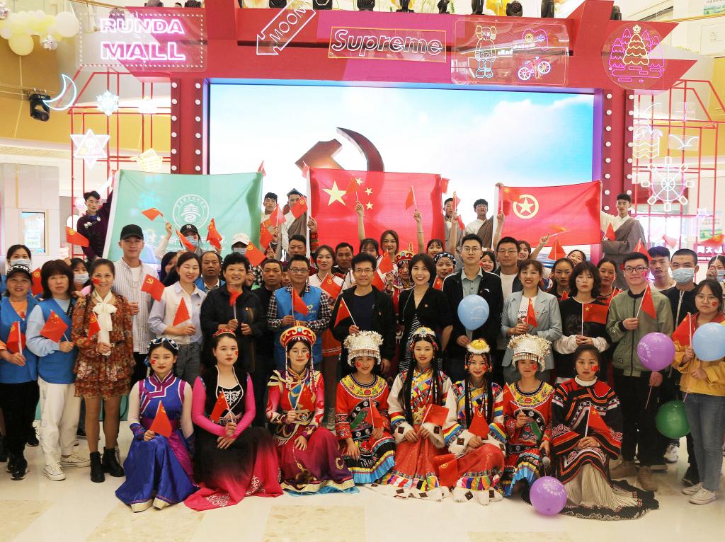 上午11时,润达国际购物中心人声鼎沸。“我和我的祖国,一刻也不能分割......”听到这饱含深情的旋律,在场观众不禁都把脚步放缓,驻足欣赏。身着少数民族服装的青年学子们手挥小红旗走进现场,跟随领唱齐唱歌曲《我和我的祖国》。