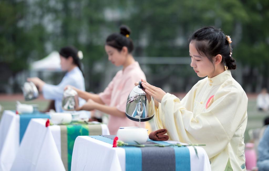 舞蹈《奔跑的青春》为茶会拉开了序幕。大家在一片宁静、美好的氛围中席地而坐,开始泡茶品茶;随后,校茶艺协会的学员们一一向大家展示了红茶、花茶、绿茶茶艺的冲泡程序,大家在优雅古典的名曲中品出了大自然的气息以及“人生百味”的感悟。在茶艺展示的过程中,同学们纷纷向自己的母亲敬奉一杯茶,大家在活动中更加懂得了知恩、感恩、报恩的道理。