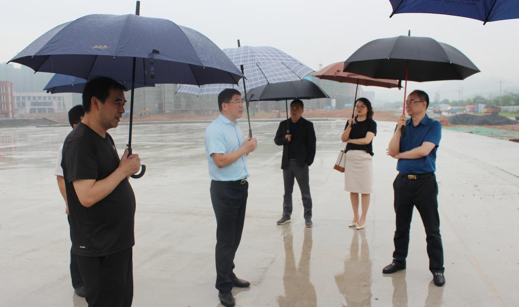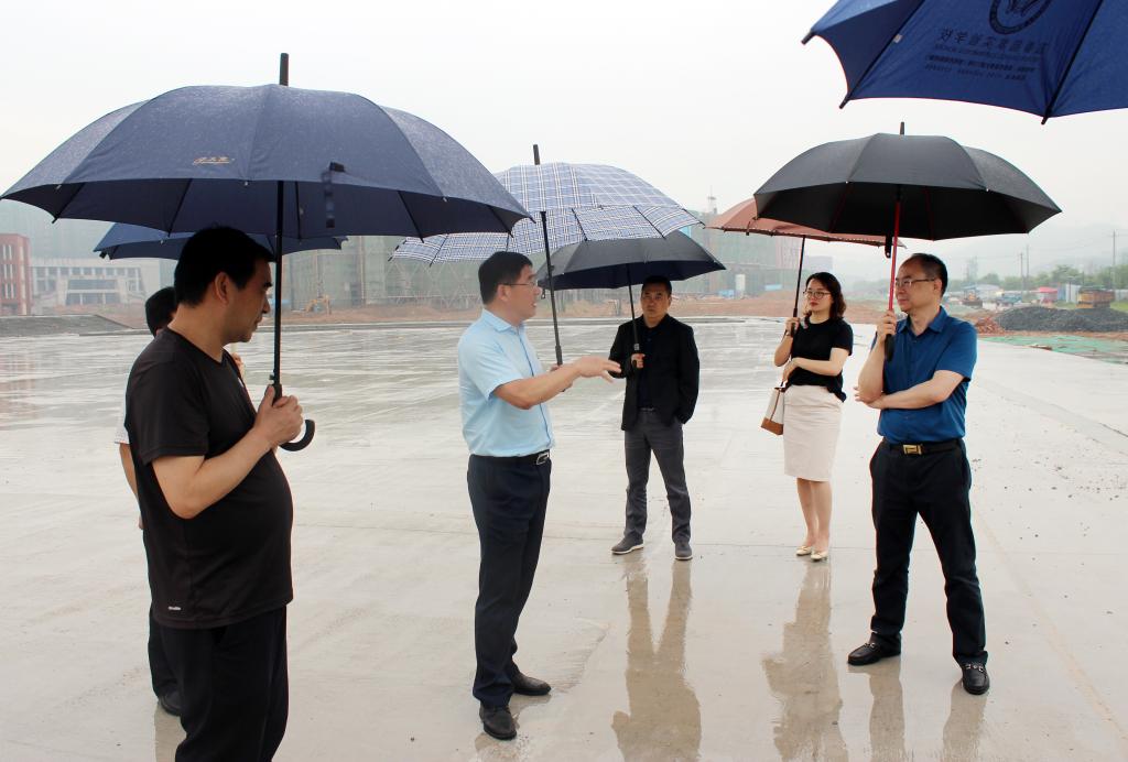本站讯(新校区项目部 潘睿琦 )5月13日下午,教育部科技发展中心网络信息处处长马亮,唐山工业职业学院原党委书记田秀萍,教育部科技发展中心专家晋军,国家职业教育虚拟仿真示范实训基地总经理项顺、运营部经理周玮一行冒雨到万象城官网新校区建设现场调研指导。省教育厅副厅长裴鸿卫、职成处一级主任科员杨涵深,万象城官网党委书记任军、校长杨云山、纪委书记夏剑宾等一行陪同调研。