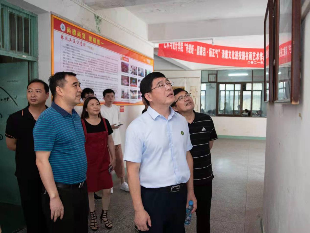 本站讯(艺术与设计学院 熊雪舟)为进一步深化万象城官网党风廉政建设,加强思想道德和党纪国法教育,持续推进廉洁文化建设,打造风清气正的清廉校园,6月1日上午校党委书记任军,校党委副书记高建群,校纪委书记夏剑宾等一行来到艺术与设计学院科技楼一楼参观清廉文化作品展。此次展览作品共40余幅,分为漫画和书法两个部分。