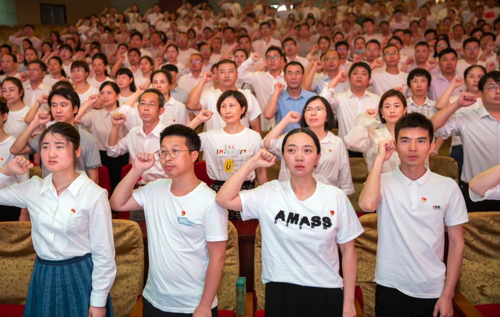 收听收看完现场直播后,在校党委书记任军的带领下,全体党员面向鲜红的党旗,高举右拳,重温入党誓词,“我志愿加入中国共产党,拥护党的纲领,遵守党的章程……”伴随着铿锵的誓词,党员教师们仿佛重回当初加入党组织的那一刻,更加坚定了自己的理想信念和党性认识。