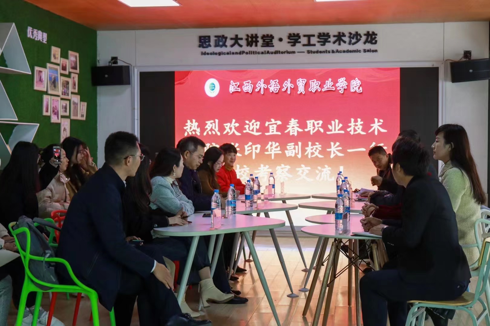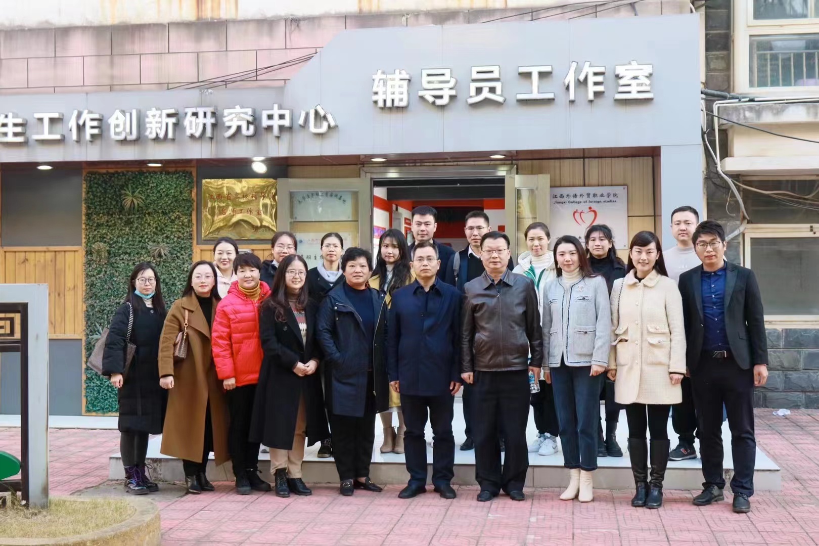下午,张印华一行来到江西外语外贸职业学院,首先参观了该校大学生思想政治教育基地“立德树人馆”,随后进行面对面交流,双方就辅导员工作室建设、红色班级创建、学生社团管理、学生管理等进行了深入探讨。最后参观了江西省高校辅导员名师工作室——宫婷婷工作室,全体辅导员在工作室进行了宣誓,由江西省2018年“最美辅导员”宫婷婷领誓。