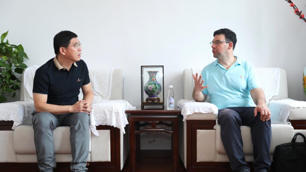 任军与Simon Appleton 一行在天工楼会客室举行座谈交流,双方围绕新西兰志愿者的教学、生活,以及万象城官网与新西兰之间的教育合作路径等方面进行交流。
