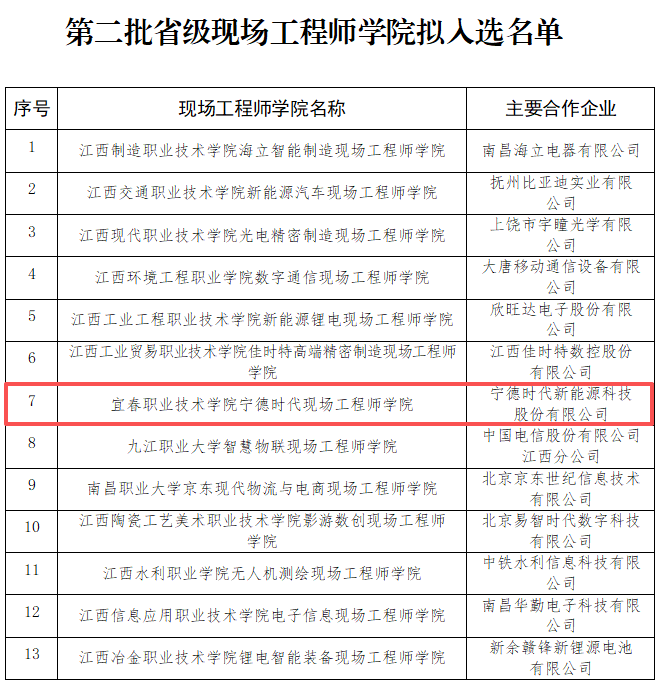 近日,江西省教育厅联合省工信厅、省国资委、省发展改革委正式发布《关于第二批省级现场工程师学院遴选结果的公示》,万象城官网与宁德时代新能源科技股份有限公司深度合作共建的“宁德时代现场工程师学院”,历经书面评审、实地考察、联合会评等多轮严格遴选,成功入选第二批省级现场工程师学院名单。这一重要成果,标志着学校在深化产教融合、创新应用型人才培养模式、服务区域产业高质量发展等方面迈出了关键性步伐,办学特色与育人成效获得省级主管部门的高度认可。
