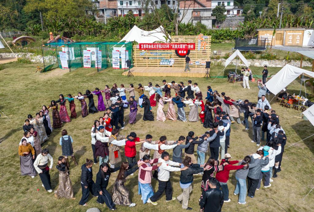 飞扬的歌声,吟唱着难忘的时光;灵动的舞姿,演绎着共同的向往。舞台区的民族歌舞表演将活动推向高潮:藏族小伙带来《锦城锅庄》,刚健有力的舞步迸发着高原的豪情;蒙古留学生表演《草原风姿》,舒展大气的动作展现着草原的辽阔;新西兰志愿者献唱经典歌曲,明快动人的旋律传递着异域的风情;藏族姑娘演绎《那曲锅庄》,优美流畅的舞姿流淌着雪域的温婉;马来西亚留学生奉上《南北大道》,活力四射的说唱迸发着青春的气息;蒙古留学生演唱《AYNII SHUWUUD》,深情悠扬的歌声萦绕着草原的浪漫。当《芒康锅庄》的乐声响起,全体师生携手登场,踏着欢快的节奏,围成同心圆圈。这一刻,大家手手相牵、心心相连,共同沉浸在民族团结的美好时光中!