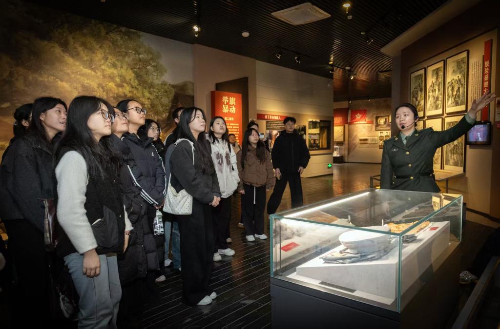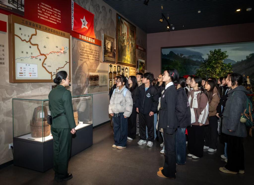 仪式后,一堂“行走的思政课”随即拉开帷幕。师生们跟随讲解员,走进纪念馆展厅。珍贵的历史图片、厚重的革命文物,以及生动复原历史场景的雕塑与多媒体影像,瞬间将大家带回那段风雷激荡的岁月。“军叫工农革命,旗号镰刀斧头”的壮阔诗篇仿佛穿越时光,在实物与图景间浮现。在湘赣边秋收起义前敌委员会旧址——萧永翁祠内,师生们近距离参观陈列的会议桌和抗战兵士的卧室,在沉浸式观览中深切体悟“红色政权来之不易、新中国来之不易”。