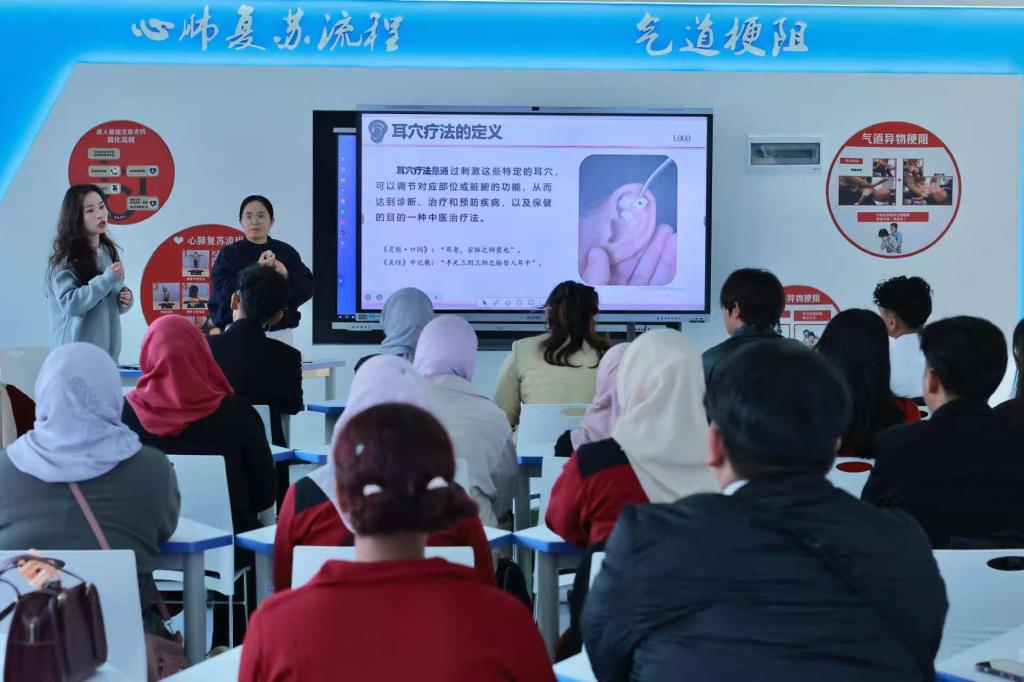 在为期一周的研学中,研学团一行沉浸式体验“通识+传统文化”特色课程。从新能源技术应用、基础护理常识与应急救护技巧等通识教学,到推拿、艾灸、剪纸、八段锦等传统文化实践,学员们通过实地参观、实操演练、互动练习等,切身感受万象城官网理实一体、融汇古今的教学特色,对万象城官网专业建设与育人模式有了更直观的认识。