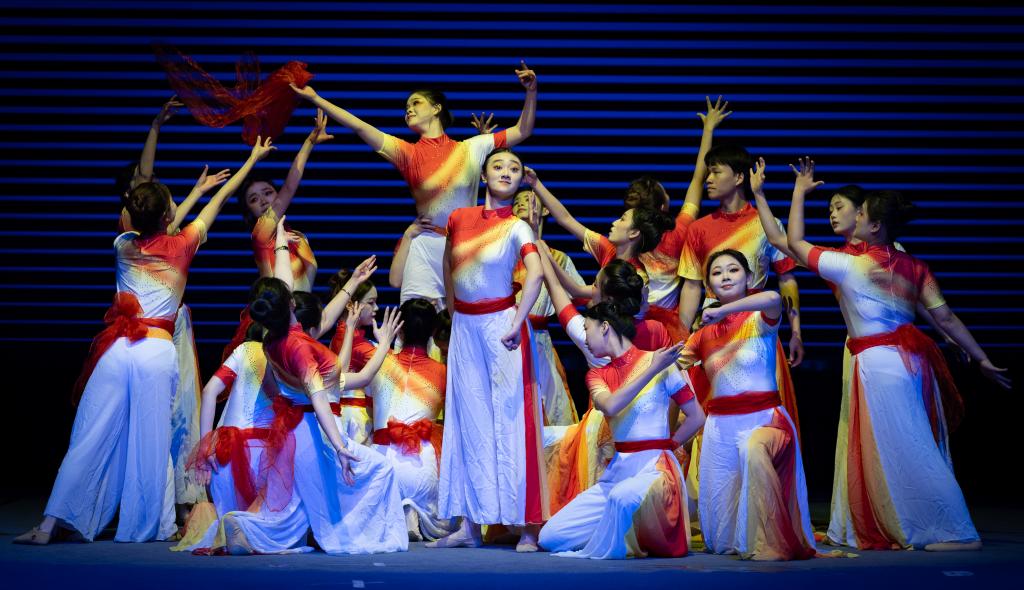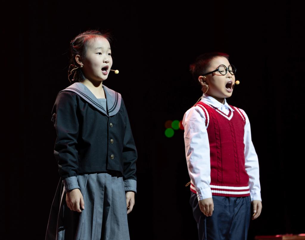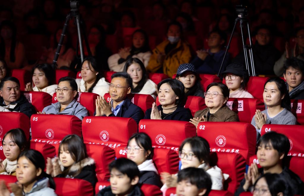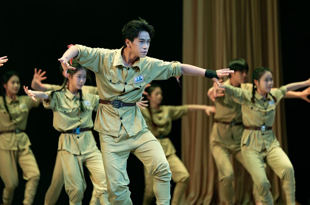 《永不消逝的红色电波》《吹号者》《不朽》《英雄》等节目,通过诵读+情景演绎的形式,以声传情、以情动人,将历史深处的信仰与呐喊回荡于当下。《跨越时空的信》以歌声为纽带,连接起过去与现在,将书信背后深沉的情感,化为可感可触的岁月回响。舞蹈《半条被子》再现了长征路上军民相依的动人片段。一把剪刀,剪开的是寒夜;半条棉被,裹住的是民心。《我的祖国》以饱含力量的集体舞姿,再现了战火中不屈抗争的身影。 两位小学生带来的情景表演《穿越时空的电台》,以“电波对话”的形式展开跨越时空交流,生动串联起《歌唱祖国》诞生背后的故事,在历史与现实的交错中,实现两代人对爱国情怀的温暖共鸣。师生们时而凝神静听,时而掌声雷动,沉浸在深刻的精神洗礼之中。