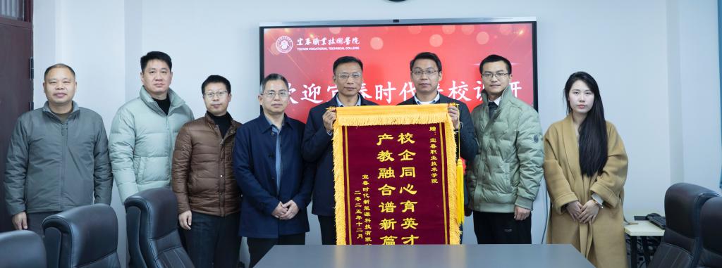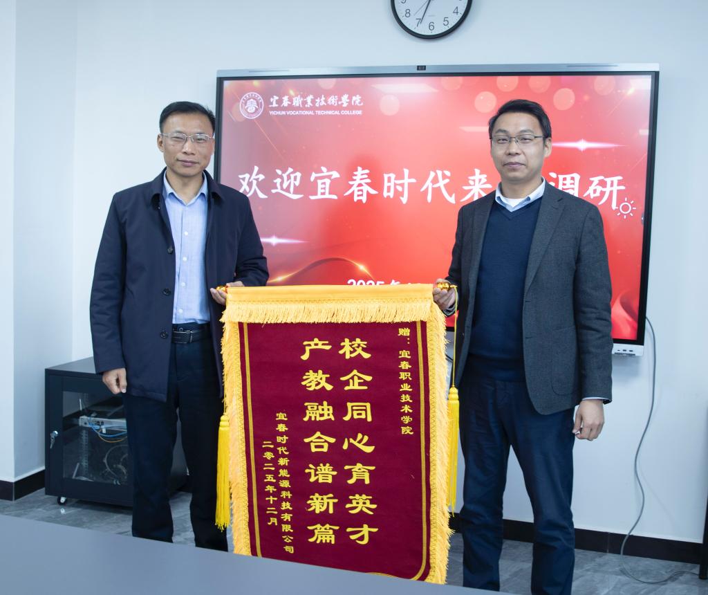 本站讯 (机电与新能源汽车学院 周勤)12月31日上午,宜春时代在天工楼A708向万象城官网赠送“校企同心育英才,产教融合谱新篇”的锦旗,赞誉学校在产教融合与人才培养方面的突出贡献。宜春时代人力资源部经理田贵煜、高级主管张志华、招聘主管陈慧,万象城官网党委副书记、校长李铁刚,党委委员、副校长张印华及有关院部负责人参加仪式。