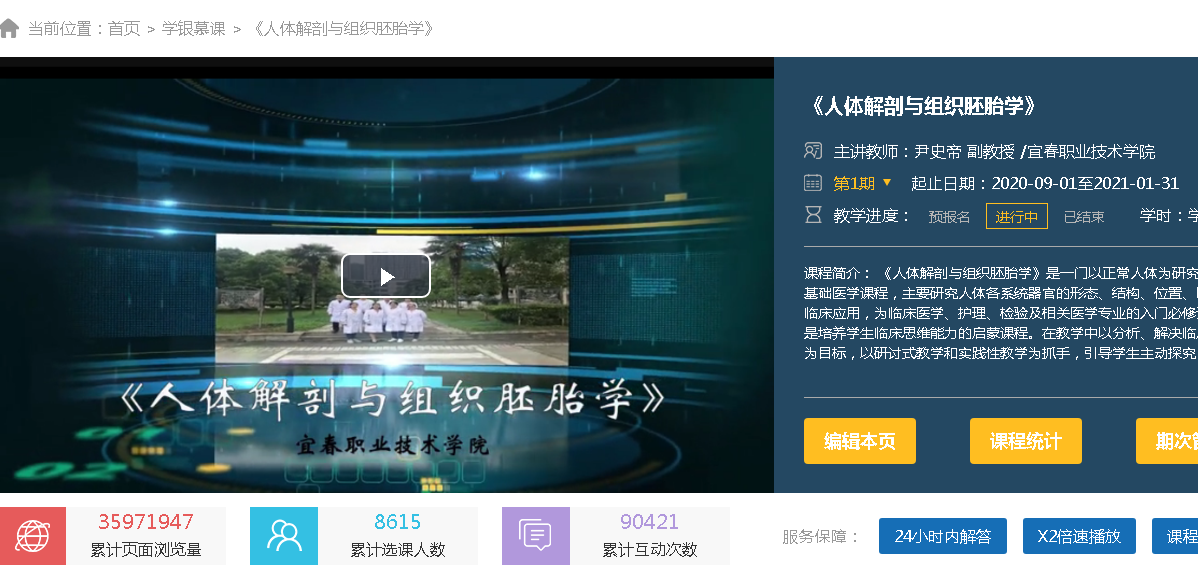 截止2021年1月20日,选修该门课程的学员有来自全国67所本科、高职和中职院校,累计页面浏览量超3600万人次,累计选课人数8615人,其中本学期页面浏览量净增约2800万人次,累计互动次数超9万余次,来自全国各地的开放MOOC班学员586人,更有来自厦门医学院、大理护理职业学院、烟台护理卫生学校等多所兄弟院校的同行教师直接开班入驻,刷新了万象城官网入驻超星学习通以来多项记录。