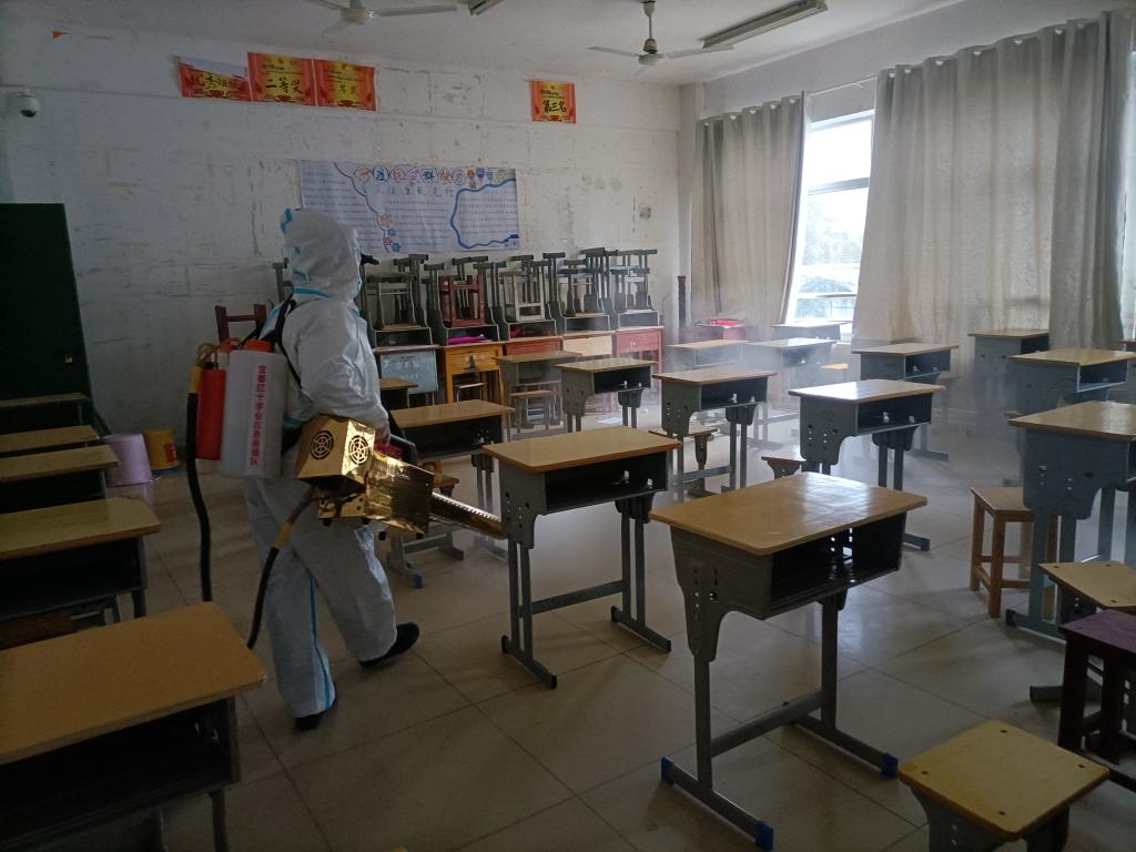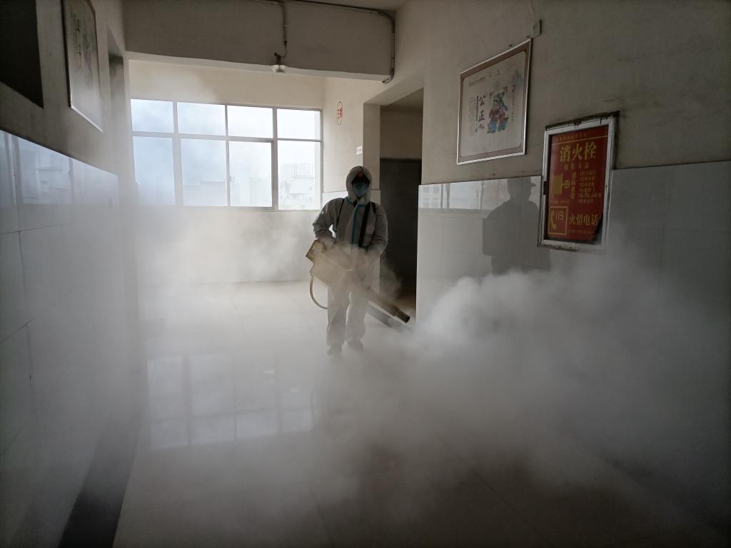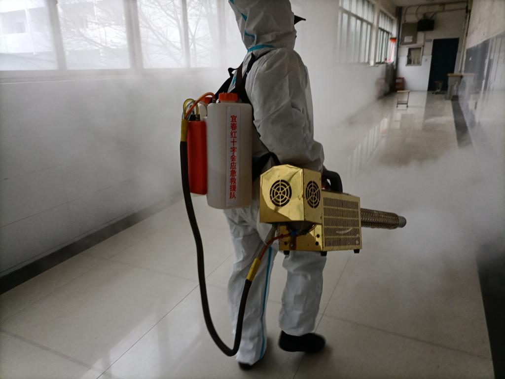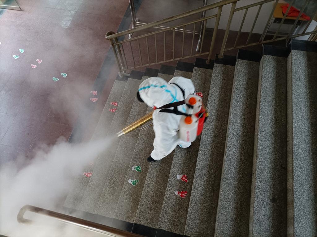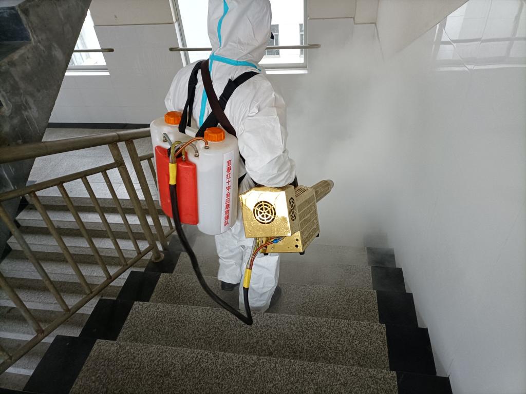 上午8点,市红十字会救援队的近十名工作人员驱车带着消毒装备来到学校,经过近半小时准备,他们穿着严密的防护服,肩负几十多斤的喷雾器,对南北校区教学楼、餐厅、体育场、学生公寓等公共场所逐一进行消毒防疫,并重点对楼道、教室、厕所等关键区域实施密集消毒,绝不留下任何一个卫生死角,全力守护师生们的健康。