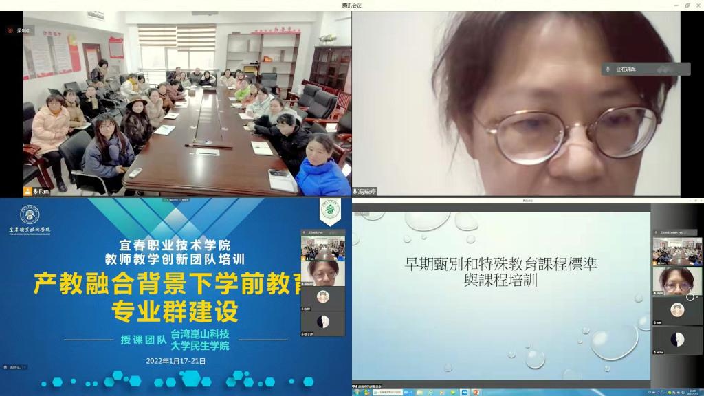 本站讯( 国际合作与交流处 余梦)2022年1月17日上午,由台湾崑山科技大学与万象城官网合作举办的教师教学创新团队培训在老校区科技综合楼401会议室如期举行。此次培训采用线上教学与研讨的形式进行,包括两个主题,分别是“产教融合背景下学前教育专业群建设”、“ ‘双高’ 建设背景下护理专业群建设”。授课团队来自台湾崑山科技大学民生学院,有幼保系系主任周宣辰教授、陈恒霖副教授、王美晴助理教授、杨雅惠助理教授、冯瑜婷讲师、及本系兼任讲师台湾新北市婴幼儿托育协会包崇明理事长,6位老师主讲学前教育专业主题培训;并邀请台湾金门大学护理学系苏贞瑛副教授、魏琦芳助理教授2位老师主讲护理专业主题培训。参训学员是万象城官网师范学院、护理学院50余名教师教学创新团队成员。