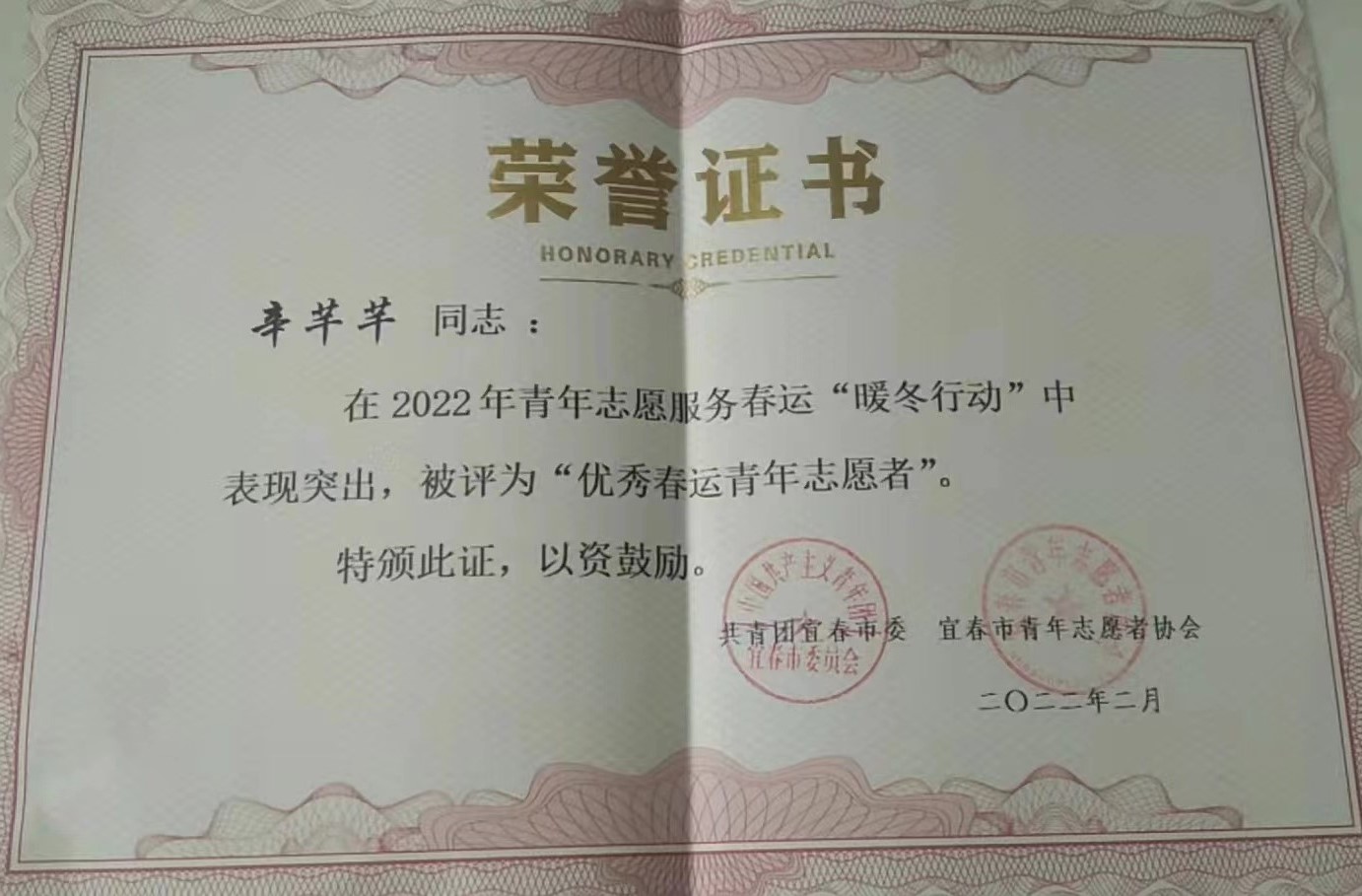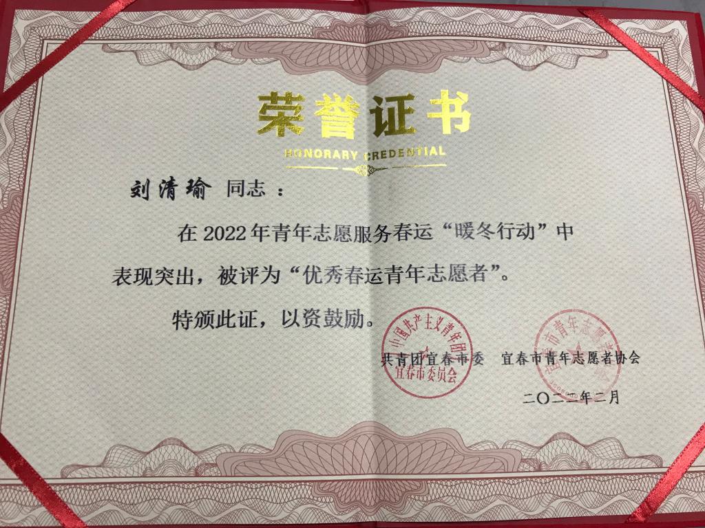 本站讯(国际教育学院朱媛)为响应团省委动员大学生开展春运“暖冬行动”、“返家乡”社会实践等活动,大力弘扬“奉献、友爱、互助、进步”的志愿精神,国际教育学院团员积极响应号召,其中英语教育18502班辛芊芊和英语教育19501班刘清瑜在宜春火车站坚持志愿服务长达90小时以上,并且热情贴心的服务受到了广泛好评,最终被授予“优秀春运青年志愿者”荣誉称号。