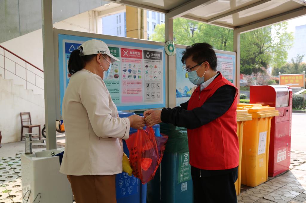 随后,机关第一党支部党员们向路过的同学发放垃圾分类知识宣传单,讲解相关知识,并给垃圾分类指导员送上慰问品,向她们的辛勤劳动表示感谢和慰问。