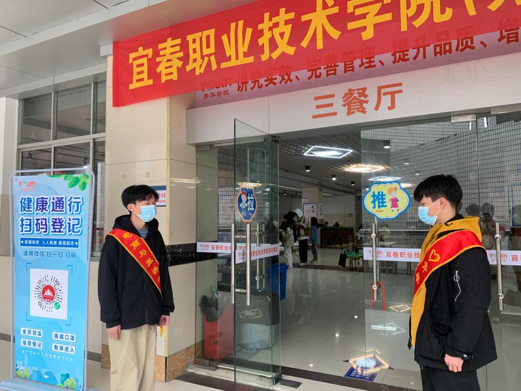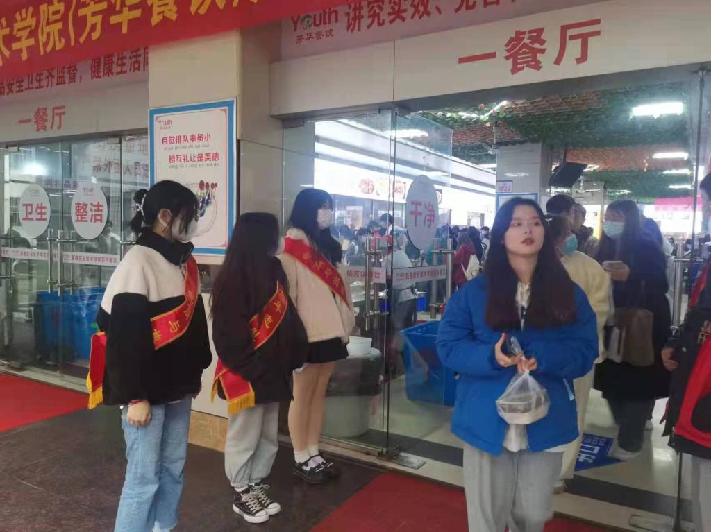 活动中,志愿者们身穿红绶带在门口引导秩序,引导同学们守住“一米线”,不聚集,不插队,佩戴好口罩。第一,用餐前提前取下口罩,少交流,专心吃饭,避免飞沫传播。就餐结束后,及时离开食堂,给他人创造良好就餐环境。第二,倡议同学们尽量减少打包带回宿舍用餐。疫情期间,文明就餐是一种礼貌,守好责任田,站好志愿岗。